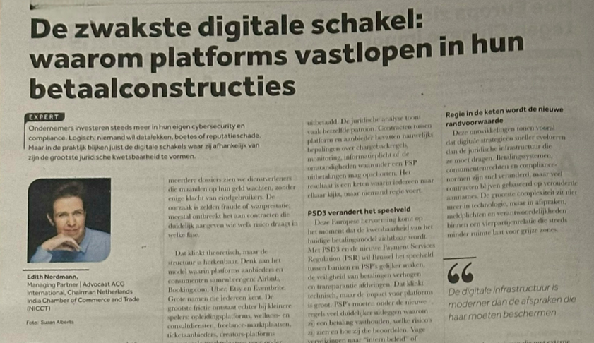 In Het Financieele Dagblad van 8 december 2025 waarschuwt de Managing Partner van ACG International dat veel platforms te maken krijgen met vastgehouden gelden door PSP’s. Niet door fouten, maar door platformcontracten die niet voldoen aan PSP-compliance. Hierdoor kunnen betalingen blokkeren en de keten stilvallen. Edith Nordmann legt uit hoe platforms dit kunnen voorkomen.